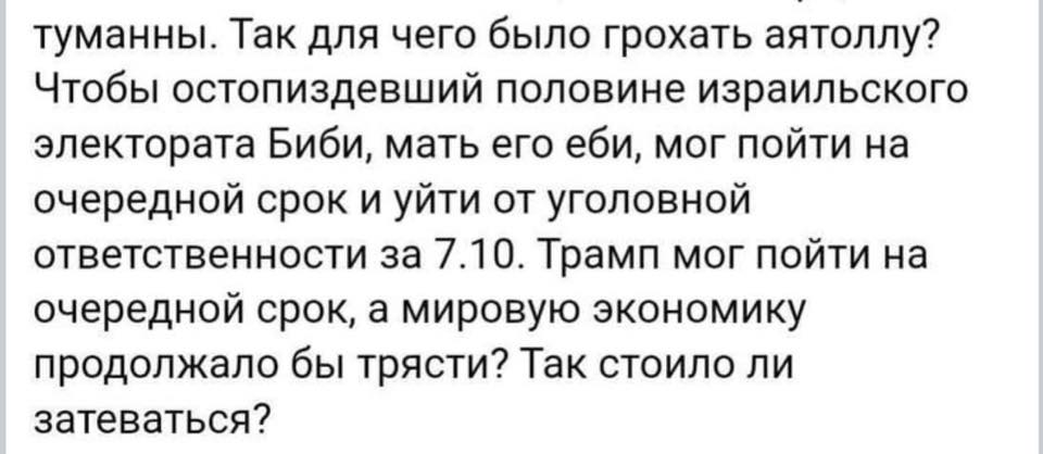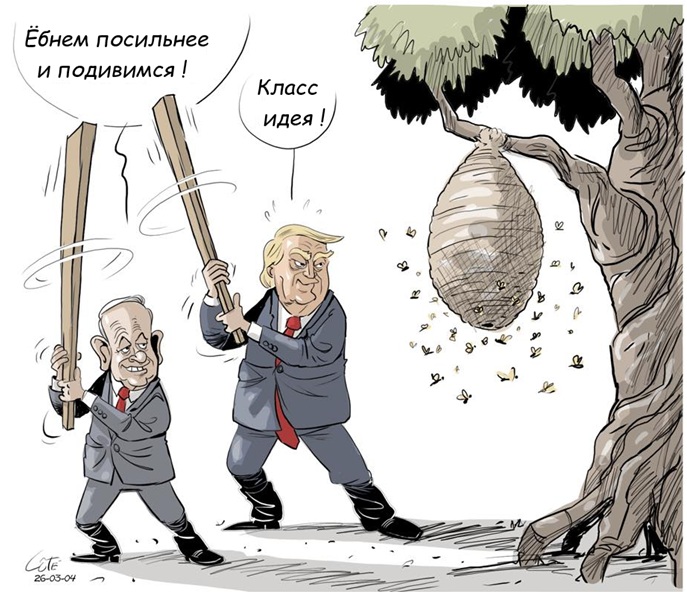 На Фейсбуке прошли политсобрания русскоязычных израильтян, которые гневно осудили (читай смешали с грязью) отличного поэта Игоря Иртеньева (живущего в Израиле же). За то, что тот позволил с иронией отозваться о действиях Биби и Трампа на Ближнем Востоке и поставить под сомнение чистоту их побуждений ( вот например ). Вряд ли Иртеньев претендует на звания нобелевского лауреата в области геополитики, но своё мнение может свободно высказывать. Однако те ушаты дерьма, которые на него за это полились, были просто в лучших традициях совковой гопоты, причём многие мерзавцы атаковали в основном его поэтический дар, в котором они ясно дело рубят больше Пушкина и Быкова вместе взятых. И если эти партийные собрания являются хоть каким-то индикатором морального облика русскоязычных израильтян, то извините такой Израиль конечно оставляет желать лучшего. Ну и бонусом карикатура местного художника (с моим вольным переводом ).